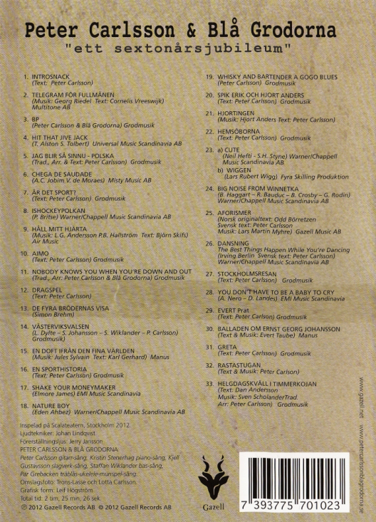 Peter Carlsson & Blå Grodorna recorded at Scalateatern. Few artists apart from Peter Carlsson would pay attention to "A Sixteenth Anniversary", but together with his Blå Grodorna he makes brilliant versions of many of his stage classics, both songs and now well-known monologues. A must on the record shelf for all Peter Carlsson fans.